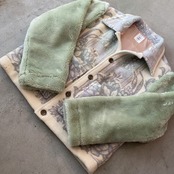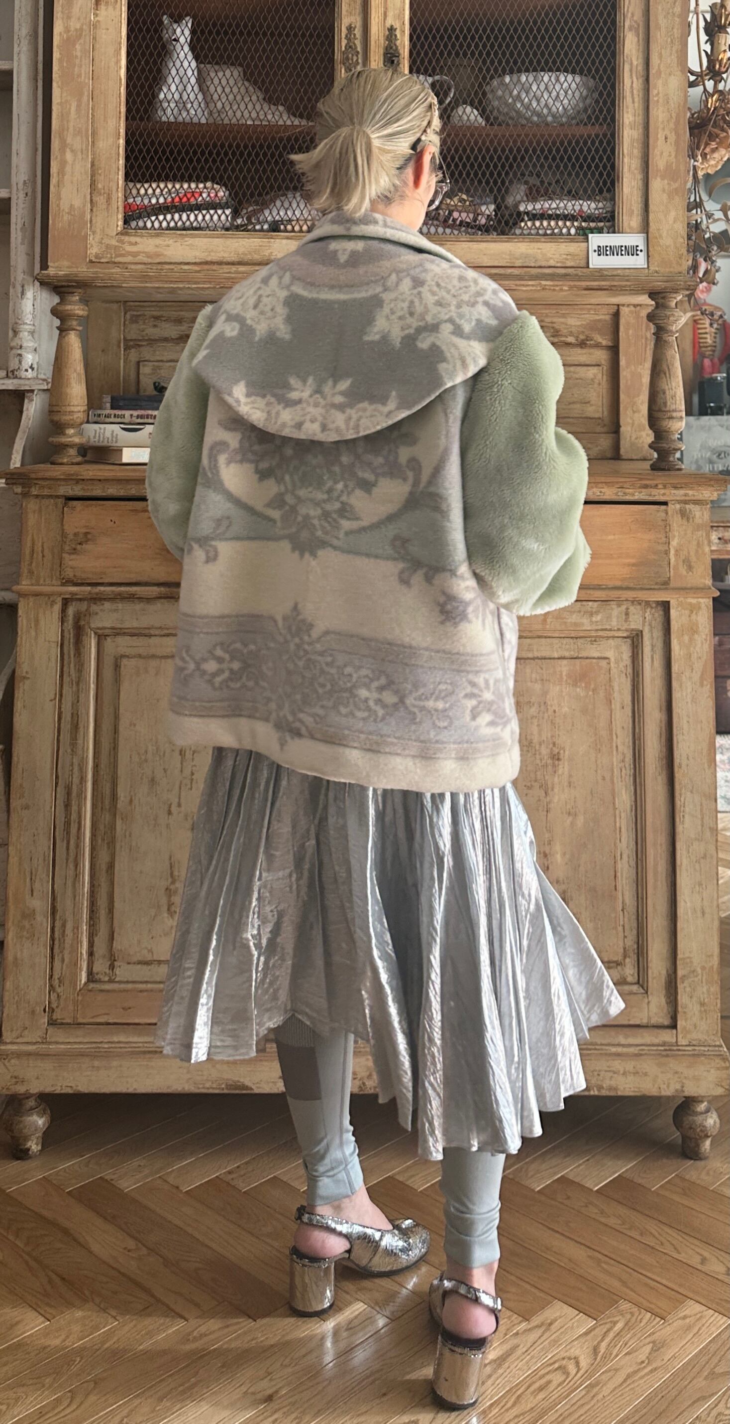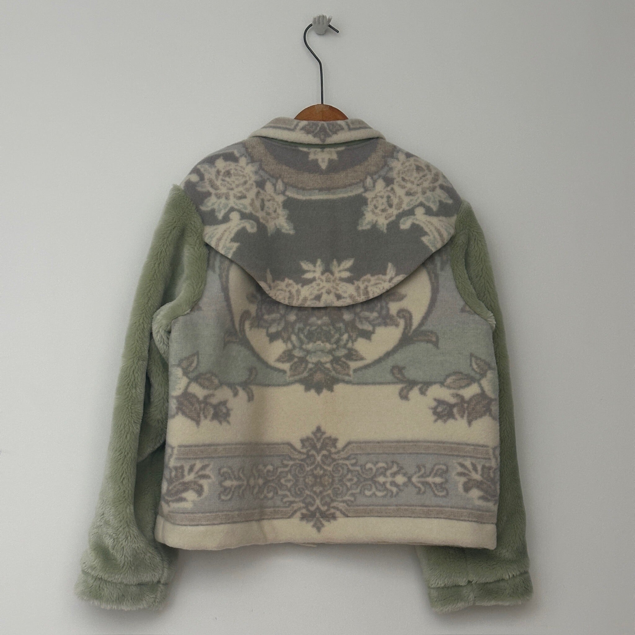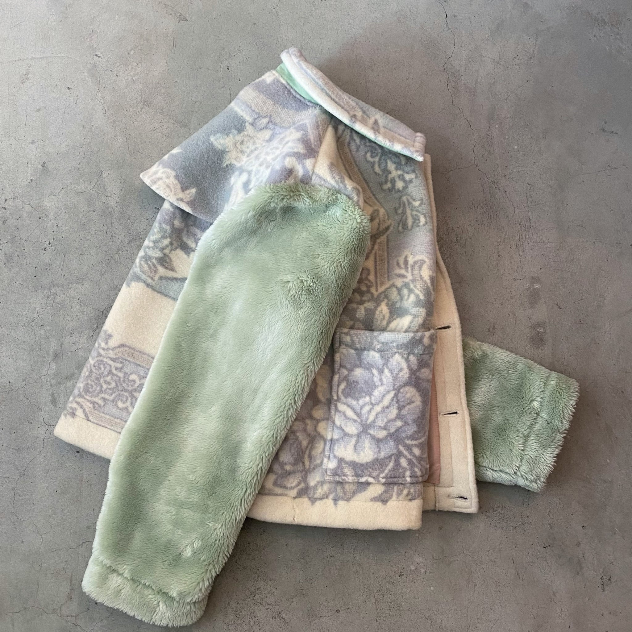 while the sleeves are made from a vintage blanket with a long pile.
